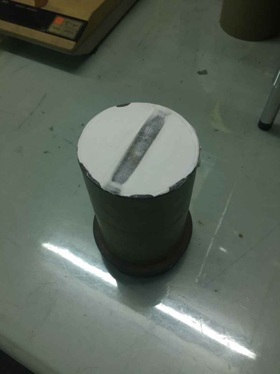03.等待石膏硬化後,拔除石膏容器底蓋,撕開封住石膏管孔洞的膠帶